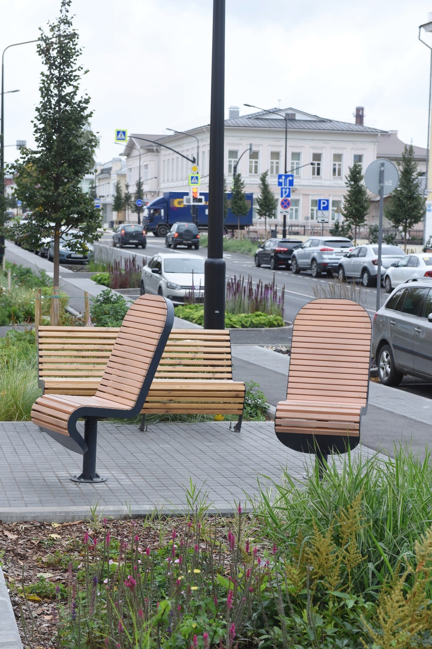 Сначала в зонах рядом с цветниками между велодорожкой и тротуарами установили широкие скамьи с удобными спинками. Затем на бетонном ограждении у здания университета появились настилы из эколамелей (сделаны из переработанных пакетов), получились скамейки.