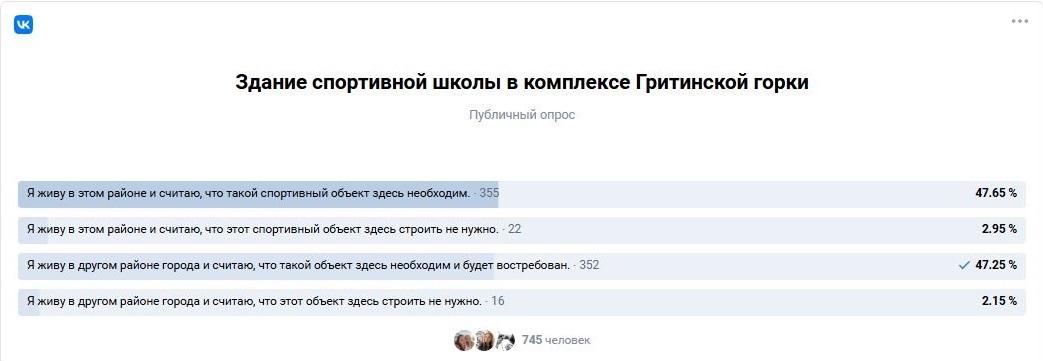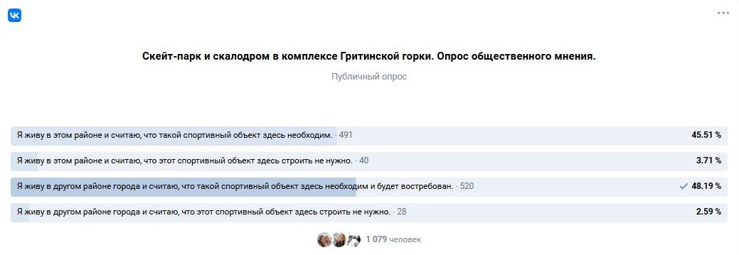 В 12 часов, как планировалось, закончился прием мнений горожан, заинтересованных в развитии Гритинской горки. Предметом обсуждения стала возможность размещения в этом комплексе двух объектов: функционального спортивного центра со скалодромом и скейтпарком, а также здания спортивной школы. О каждом объекте спрашивали отдельно. Всего поступило 1 824 мнения
