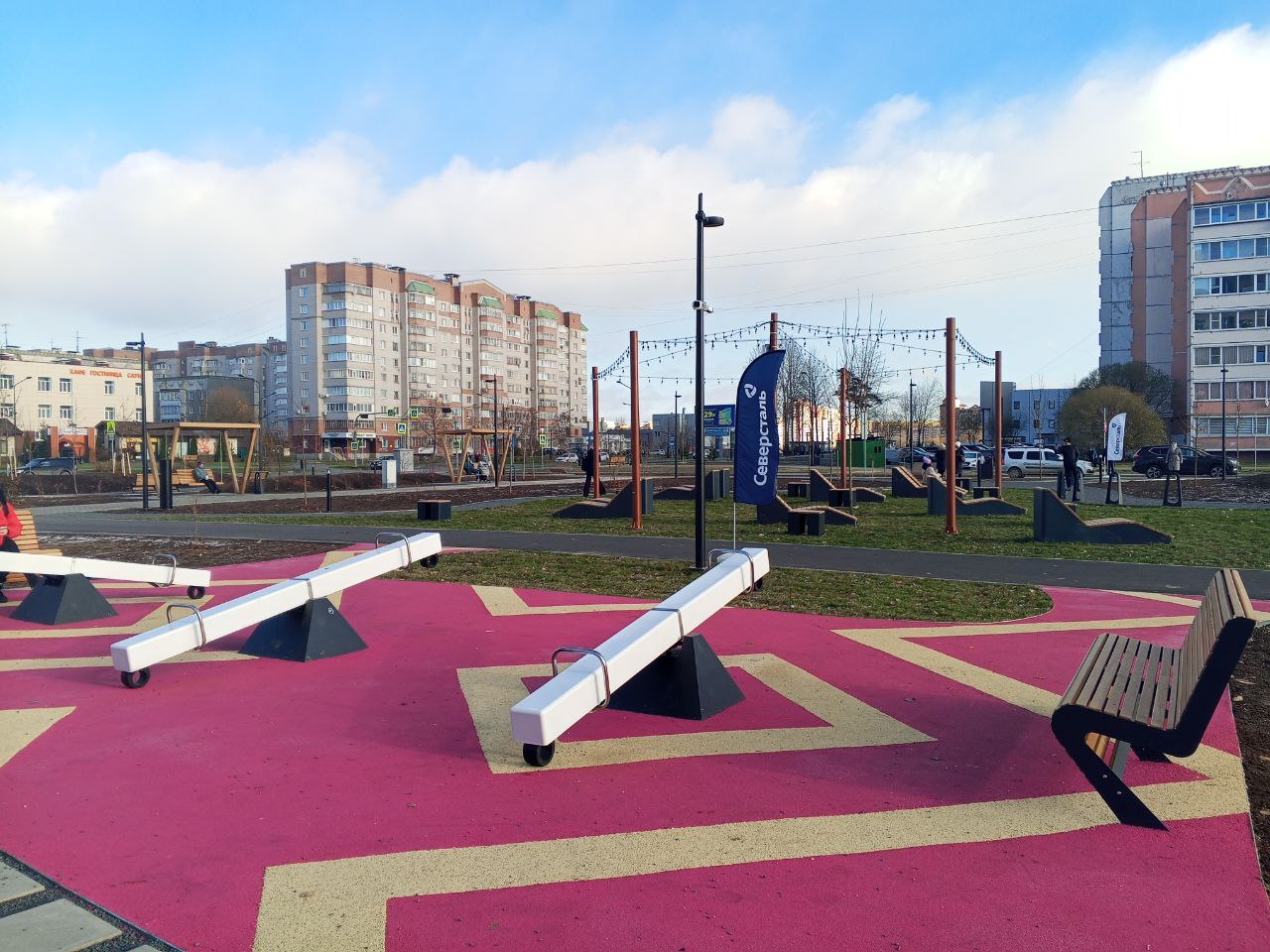 Новый сквер в створе улицы Сазонова был создан на месте заброшенной строительной площадки. В нем предусмотрены различные зоны и площадки — как для отдыха, так и для занятий спортом.Так, для прогулок с малышами установлены светящиеся качели-балансиры, а для занятий спортом оборудована площадка с уличными тренажерами, которые подходят и людям с ограниченными возможностями здоровья.
