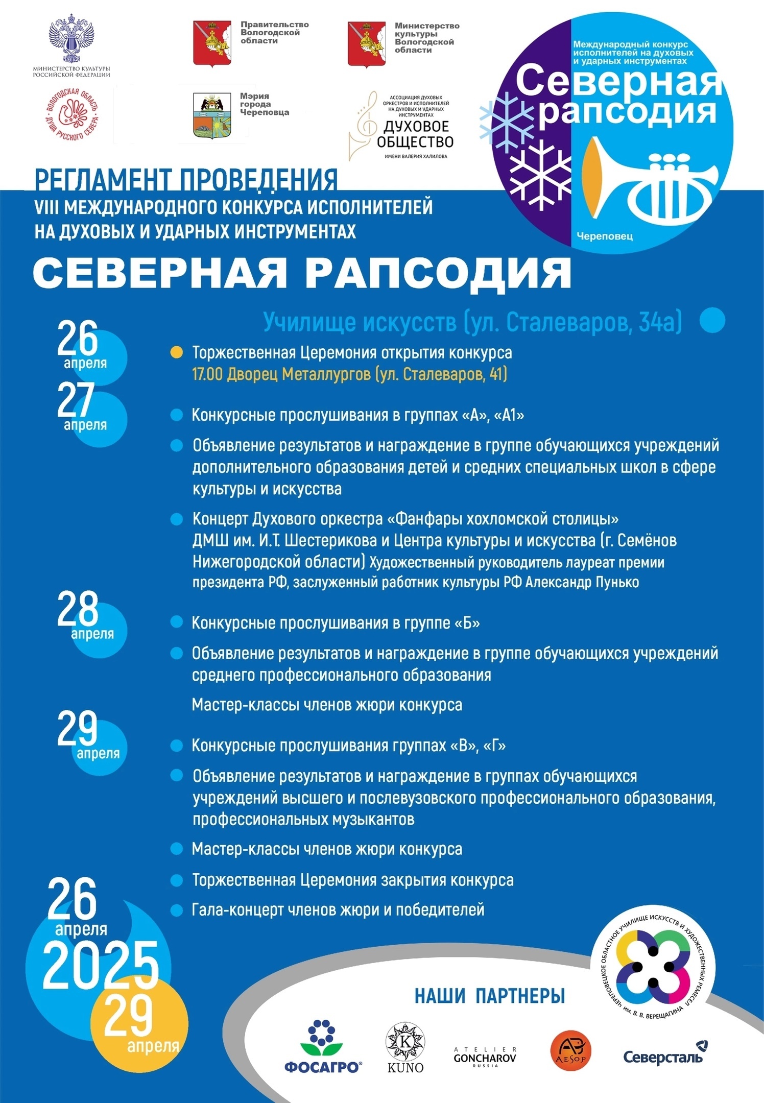 «Северсталь» входит в число ежегодных партнеров конкурса «Северная рапсодия» с 2016 года. С 26 по 29 апреля по на сцене областного училища искусств и художественных ремесел имени Василия Верещагина свое мастерство продемонстрируют более двух тысяч участников.